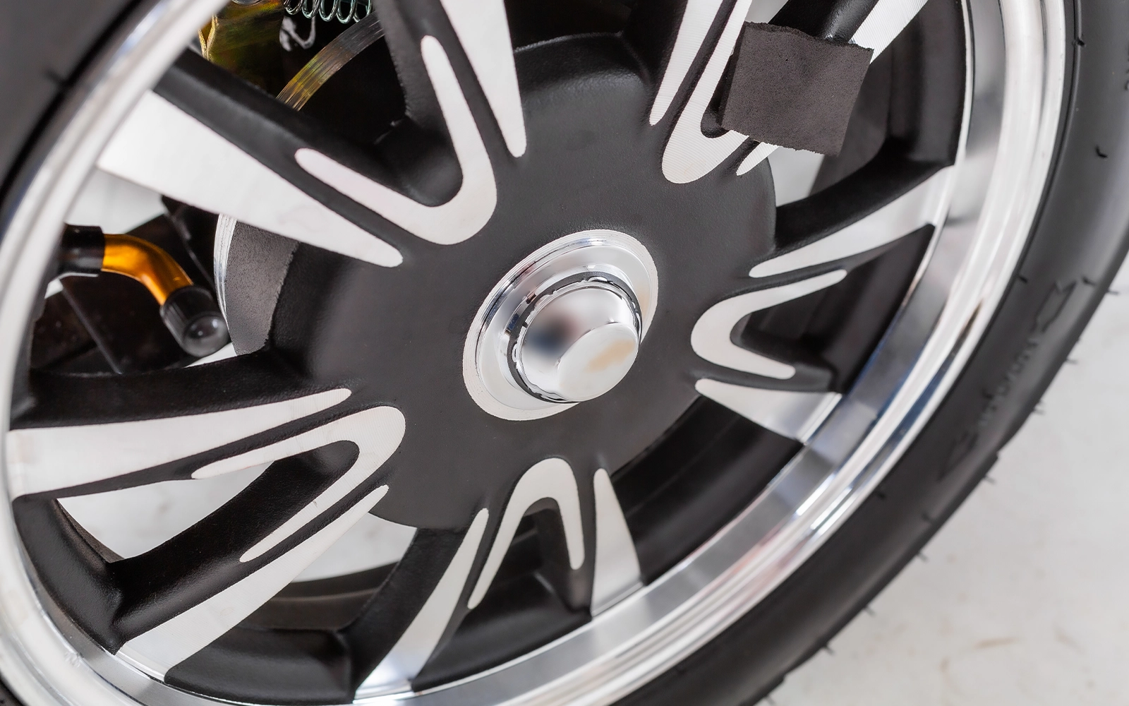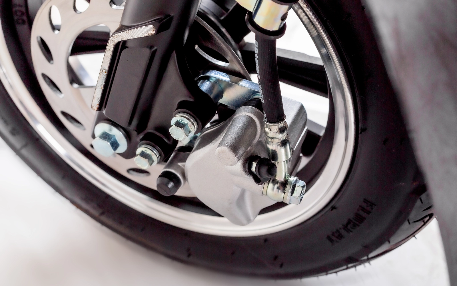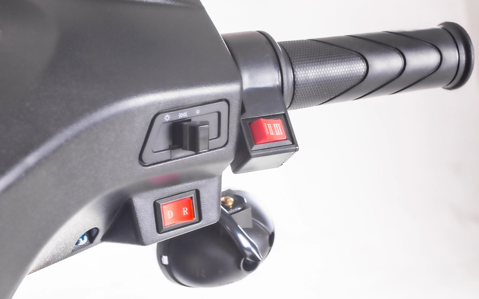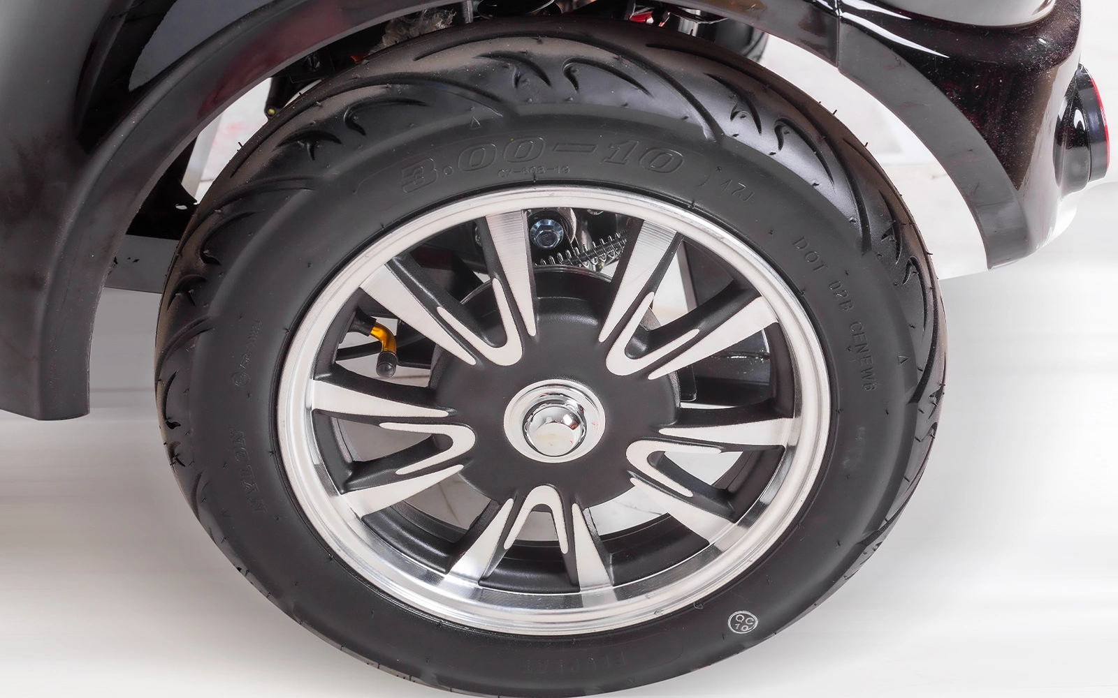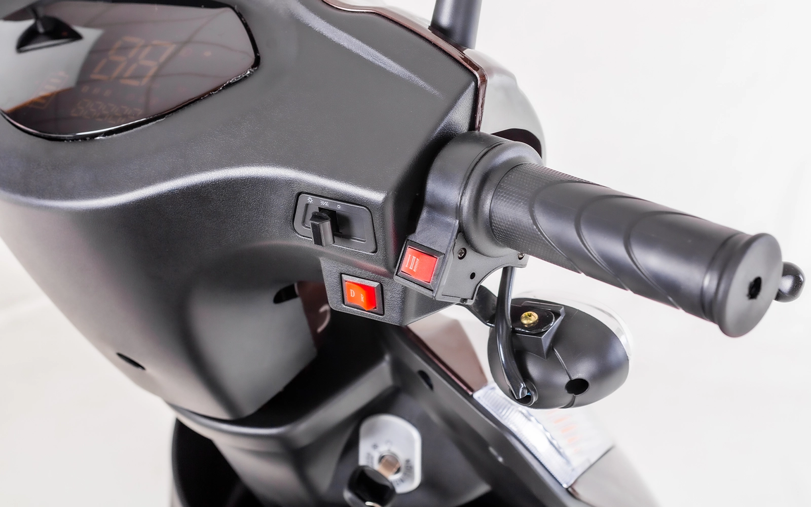 De scootmobiel is uitgerust met schijfremmen, die zorgen voor betrouwbare remkracht onder uiteenlopende omstandigheden.