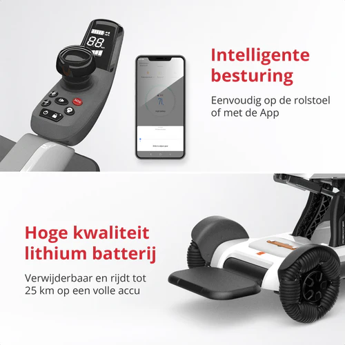 - Bediening via de app – perfect om de rolstoel vooruit te laten rijden wanneer je er nog niet op zit, of om hem netjes te positioneren
