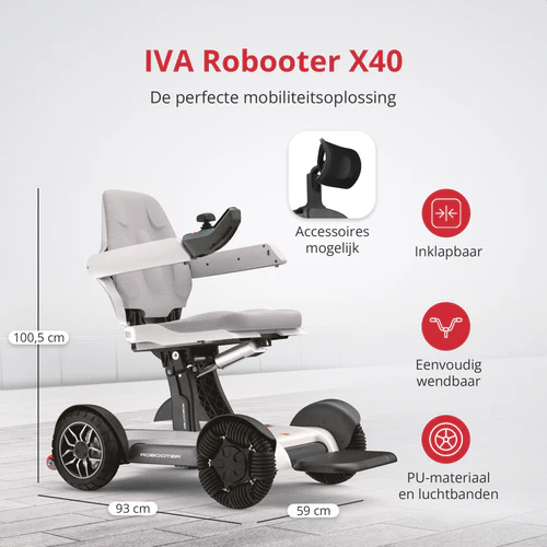 De IVA Robooter X40 is een revolutionaire elektrische rolstoel die mobiliteit slimmer, eenvoudiger en comfortabeler maakt dan ooit tevoren. Dit model is ontworpen voor wie maximale zelfstandigheid wil combineren met de nieuwste technologie. Dankzij het elektrisch opvouwbare ontwerp, de intelligente bediening en de uitzonderlijke wendbaarheid is de Robooter X40 een klasse apart. Niet voor niets werd hij bekroond met de IF Design Award, een internationale erkenning voor uitmuntend design en innovatie.